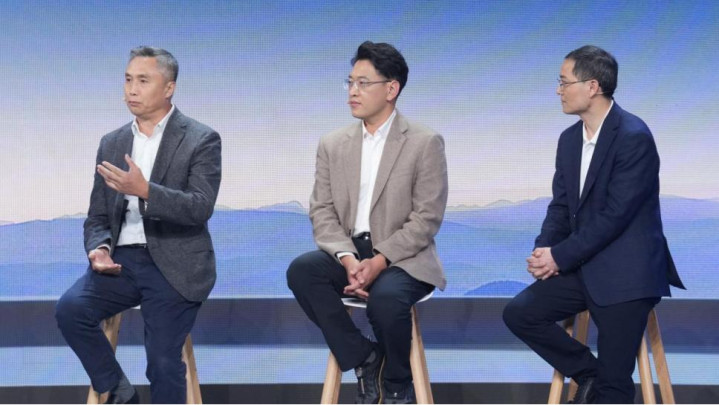 [梧桐车联科技有限公司总经理曹斌(左1)/火山引擎汽车出行总经理、具身智能研究院院长杨立伟(左2)/科大讯飞智能汽车事业部副总经理&CTO雷琴辉(左3)]