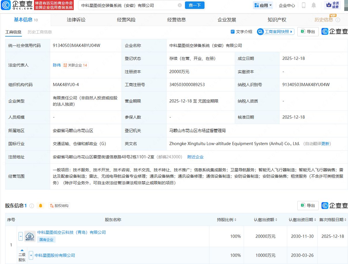 近日,中科星图低空装备系统(安徽)有限公司成立棒棒策略,法定代表人为陈伟,注册资本为2亿元,经营范围包含:卫星导航服务;智能无人飞行器制造;智能无人飞行器销售;雷达及配套设备制造等。企查查股权穿透显示,该公司由中科星图(688568)间接全资持股。